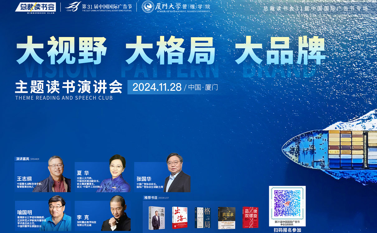 在此背景下,第31屆中(zhōng)國(guó)國(guó)際廣告節将在2024年11月27日-30日廈門國(guó)際會展中(zhōng)心盛大啓幕,這一擁有(yǒu)三十年豐富底蘊、享有(yǒu)廣泛贊譽的業界盛會舉辦(bàn)之際,總裁讀書會與廈門大學(xué)應邀聯合主辦(bàn)“大視野,大格局,大品牌”主題讀書演講會。這是總裁讀書讀書會第六次與中(zhōng)國(guó)廣告協會合作(zuò)在廣告節期間舉辦(bàn)讀書會專場活動。本次活動将圍繞主題領讀相關書籍,并就“如何面對和擁抱百年未有(yǒu)之大變局的挑戰與機遇?”“如何做大做強中(zhōng)國(guó)民(mín)族品牌?”“如何讓更多(duō)中(zhōng)國(guó)優秀品牌走向全國(guó)全世界?”等議題展開分(fēn)享讨論。